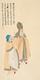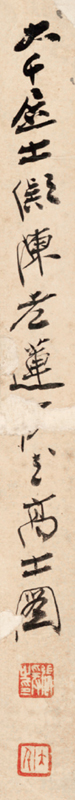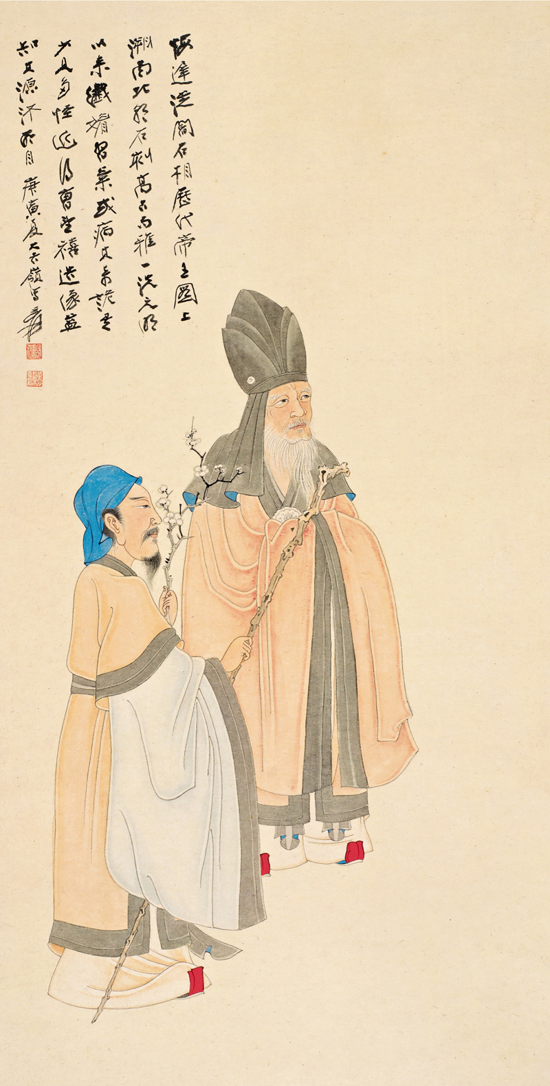 画作无背景,绘相邻站立的两位高士,长者拱手白髯,头戴高冠幅巾,着宽博袍服,脚蹬赤头舄;侧身而立的壮年者,头裹蓝色包巾,内着白袍,外罩搭护,左手持折枝白梅,右手曳杖,着赤头舄。线条圆整而爽劲,敷色雅致,气息高古,风格虽仿自明末陈洪绶,但一变老莲画中的清冷,为大千所喜的怡然温暖,与陈老莲的古淡奇崛相较,画家的秀美本色显而易见。