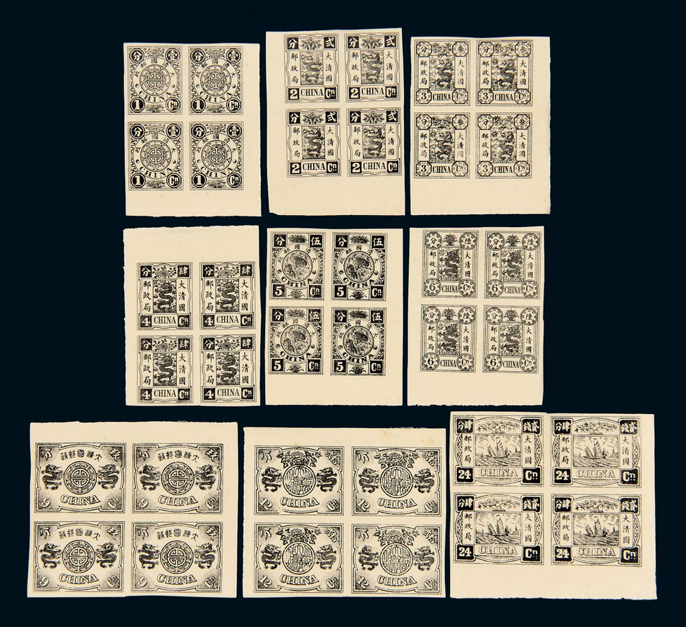 S 1897年慈禧寿辰纪念邮票(改版)小型黑色子模无齿样票九枚全四方连,印于白洋纸之上,存世仅二套,珍罕,未贴,上品