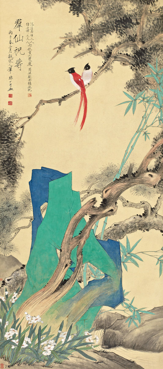 说明:《群仙祝寿》是1936年于非闇应刘金镛委托,为刘氏祝贺长辈寿诞而作。刘金镛,字振周,黑龙江人,民国年间于北京经商,经营药材及皮货生意,与军政界人士过从甚密。上款“凤翁老伯大人、伯母谭太夫人”虽不可考,但据于非闇在民国画坛的地位,刘金镛敬赠尺幅如此阔大的作品以为贺礼,亦可见其非富即贵的地位。画面布局热闹丰富,色彩鲜亮,松柏、水仙、苍石、翠竹、绶带,呼应群仙祝寿的题材,洋溢着六六双庆的吉祥气息。