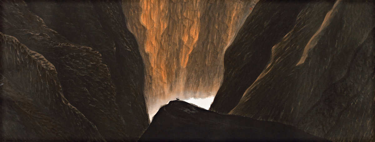 《太行暮色》中,画家以传统山水“远取其势,近取其质”的方式观照太行山,钩皴点染,一丝不苟,但他始终不忘自己的艺术个性与所处时代,强调“以己之不同感受古人之不同”,注重“以己之个性,感受自然之个性。”因此,他极力反对“笔墨至上”的观点,认为技法并非绘画的最终目的,而是要服务于精神表现:“吾于太行山野,长坪大坡之上,见磐石峥嵘,赤岩如血,似猛士之肝胆相照,搏大风而怒号,如闻燕赵慷慨悲歌⋯⋯”作品虽然采用传统笔墨语言,但在构图上,却借鉴了摄影特写的方法,裁取太行一截,上不见天,下不见地,画面左右两侧黢黑的陡坡,铺天盖地扑面而来,将画面中央下方约三分之一处的一段平缓的峰顶,挤向观者。峰顶之上,一只孤独的山羊傲然挺立,背对观者,凝望着前方云气升腾的深渊。云气上方,是如瀑布般倒悬而下的悬崖峭壁,使画面形成新异的V字型构图,如人伸臂问天,一反传统山水习见的平和中正,为画面注入一种独特的现代气息。