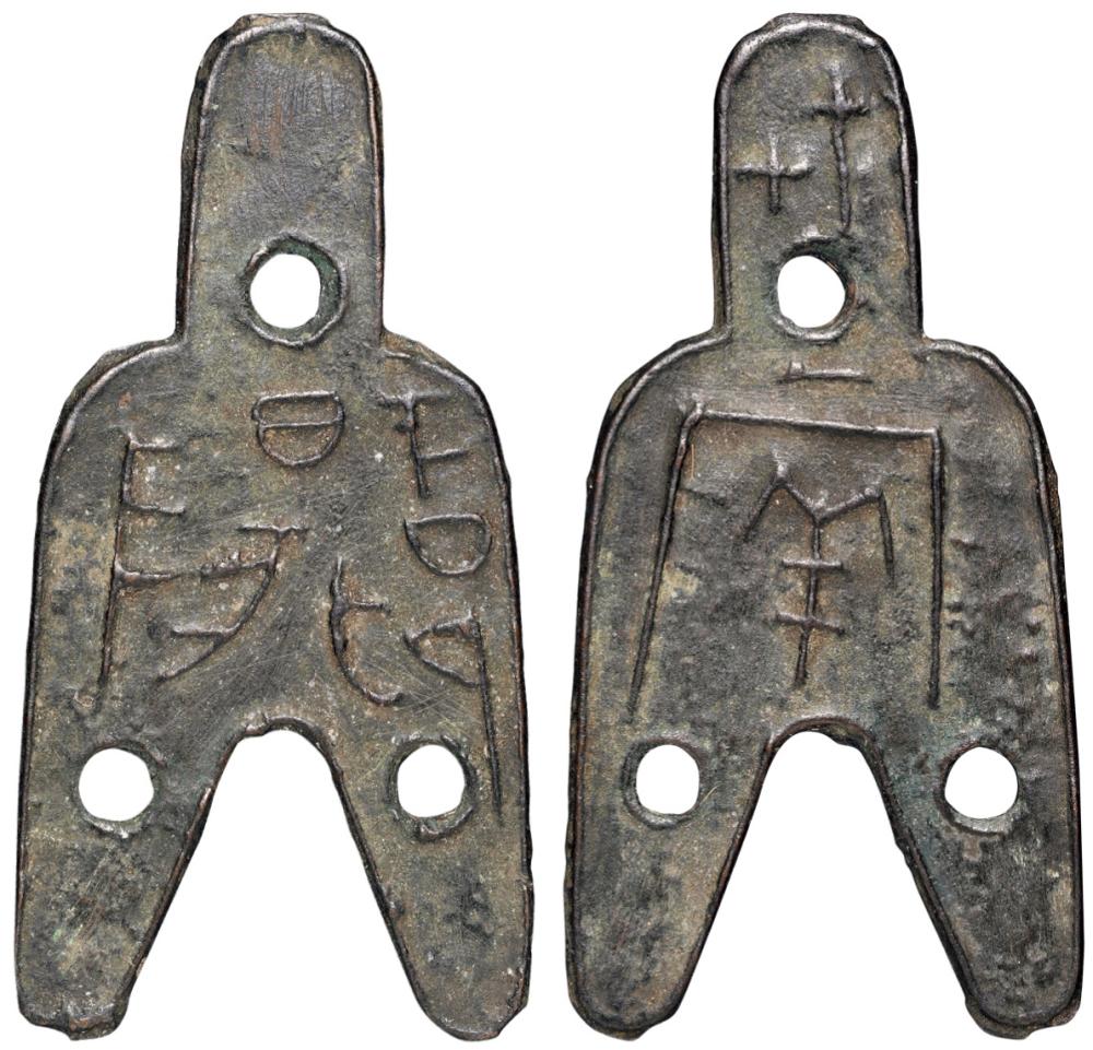 有关三孔布最早的记载,见于清嘉庆二十四年(1819)初尚龄着《吉金所见录》。拍品“下阳”背“十七·两”三孔布首度着录,则出现于张廷济《古泉拓本》,张氏手批“形质古朴,其字亦古雅可宝”;张廷济殁于道光二十八年(1848),可以据知此枚三孔布入藏清仪阁的时间下限。以后不知飘坠何方,至上世纪三十年代始见踪迹,按沈子槎批校张廷济《古泉拓本》,此币下注小字“此品余得自范福升,以让叔驯者”,则当时由沈氏经手而入齐斋秘箧可以复按。张叔驯于三十年代后期去国,遂流传海外,辗转由现今收藏家族珍藏数十年。此币不仅以珍罕见重,亦为现今存世三孔布中最早载于着录者,传世几历二百年,授受源流端绪井然,其名贵可知。
