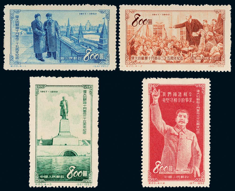 ★1953年纪20“伟大的苏联十月革命三十五周年纪念”撤销发行邮票四枚全,票面整洁,品相难得,上品