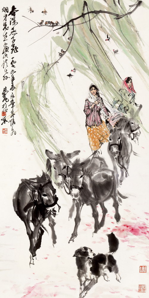 说明:此幅为黄胄画赠新加坡政要李炯才的经心之作。画面表现新疆的少数民族风情:暮春时节,春风轻拂柳丝,两位面带笑容的维族少女,正赶着一群左顾右盼、占据画面主体的毛驴前行,一只黑狗,欢快跳跃着在前面带路,空中燕雀飞舞,几只麻雀啁啾枝头,丰富的生活情境与生动的动物形象,和谐地统一在画面上。画中,柳丝已绿意葱茏,地上则残红如染,零星落花不时随风飘飞,点缀着色彩缤纷的少女衣襟。饱满的构图,挥洒飞动的线条,斑斓的色彩,洋溢着健康、欢乐、向上的生活气息。