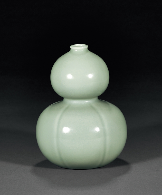 说明:青釉葫芦瓶为清代官窑经典品种,器形仿自宋元时期制品。耿宝昌《明清瓷器鉴定》中,刊有五种不同器形的雍正朝葫芦瓶线描图(参见《明清瓷器鉴定》,页231,图393);另据《清宫造办处活计清档》,乾隆帝曾下旨将太监高玉送来的冬青有盖葫芦罐交与唐英,照样烧造,所指应为常见的尺寸较大、带有葫芦蒂形盖之器类。而拍品与前述品种造型有别,未见有任何收藏着录,极为稀有名贵。