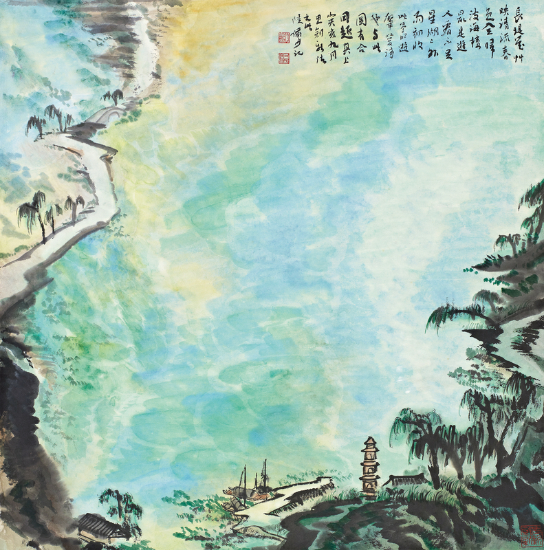 说明:陆俨少晚年孜孜以求笔墨变法,色彩的突破是此一时期重要追求。《星湖春色》作于1983年,绘广东肇庆星湖景色。1981年十二月,陆俨少赴广东写生,翌年三月方还杭州,期间游览肇庆星湖,题诗亦得于当时。构图呈U字形,画面大部分留给湖面,曲折的堤岸环围湖水,起到稳定及架构画面的作用,极具巧思。水面以西画颜料滃染而成,黄、绿、蓝各色生动描绘出微风吹皱湖水、波光粼粼的质感。石桥、泊舟、屋舍、垂柳、坡草等物象则以湿笔勾勒点染,间以泼墨,宝塔尤为点睛之笔。此作中,西画色彩及泼墨之法,与传统笔墨和谐交融,而色彩滃染所造成的湖水氤氲惝恍之趣,使画面亦真亦幻,在抽象与具象间实现完美平衡。