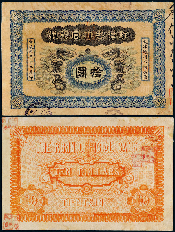 宣统元年驻津吉林官银号银元票拾圆样票一枚,背印英文天津地名,票面加盖“此系票样不得误用”,各类纸币目录均未见记载,《中国历代货币大系》未载,迄今仅发现二枚,另一枚为着名纸币收藏家李安深旧藏,曾出现于2007年北京李安深藏品专场365bet足球投注网站_365bet体育在线网站_体育平台送365彩金 ,虽边纸有二处缺损,成交价高达26.88万元;此枚色彩饱满,印制精美,除四角边纸略有揭薄,基本保存完好,极为珍罕,八成新