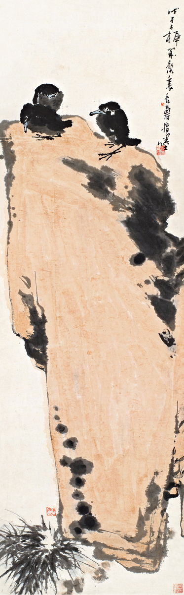 《石背幽禽》绘于1948年木樨馨里,即桂花盛开的八月,以花季记时是潘天寿上世纪四十年代作品特点。画中一块不规则的倒梯形巨石崚嶒而起,几乎充塞天地,蹲立在石顶的三只缩脖八哥自然成为画面的焦点所在,八哥眼神傲兀,斜睨周遭,显然来自八大的影响,但又毫无冷涩之感。巨石倾斜,呈岌岌可危之势,竖长幅构图更添险绝,左下角恣意点染的蒲草,又令突兀奇崛的画面顿生平衡,于凝重中见动势,极具生意。