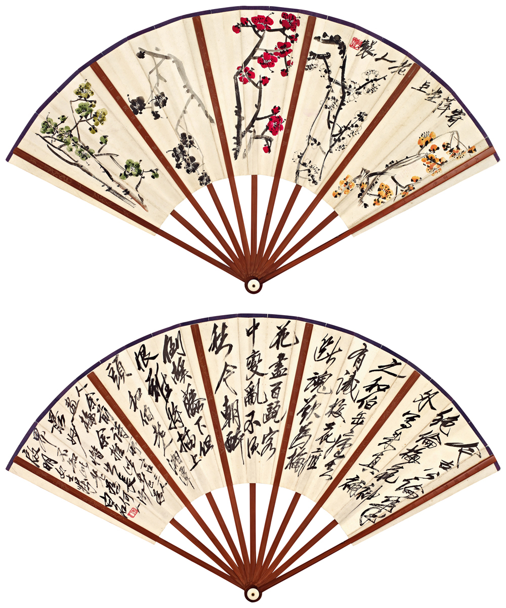梅花常现于齐白石笔端,但五色梅花并置,则几乎未见。此作在扇骨区隔的空间内绘黄、白、红、黑、绿折枝梅花各一,布局疏朗,位置经营却颇费周章,既要力避雷同,又须相互呼应。扇中梅枝穿插,花朵偃仰,造型姿态各异。画家下笔张弛有度,双钩没骨并用,挥洒自如中仍见一丝不苟,实现书写性与描绘性的平衡。梅花用色饱满,以水墨两枝作为间隔,不仅富有韵律变化,整体亦显素雅清净,饶具文人趣味。