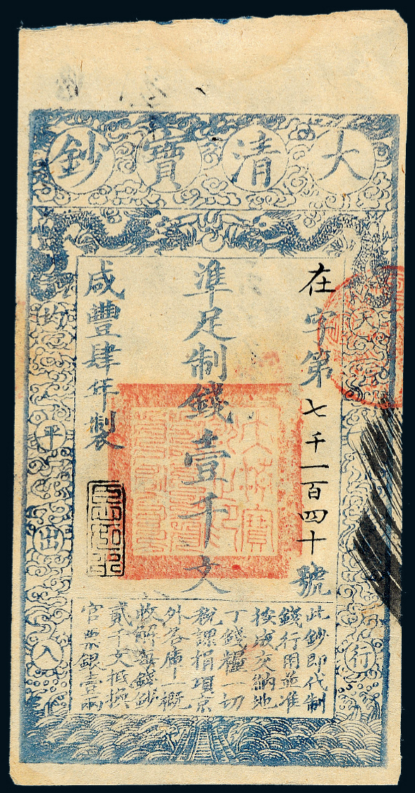 咸丰四年大清宝钞壹千文一枚,在字第七千一百四十号,背有“义和成”、“兴记”、“内务府”等墨书及印章,七五成新