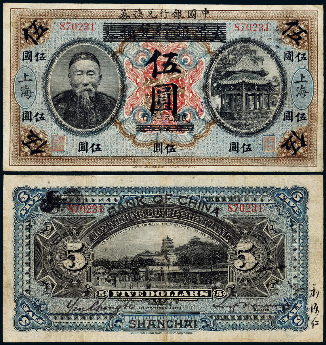 宣统元年李鸿章像大清银行兑换券改民国元年中国银行兑换券伍圆一枚,加盖“上海”地名,“宋汉章、严成德”签名,流通票所见甚少,且品相难得,珍罕,八二成新
