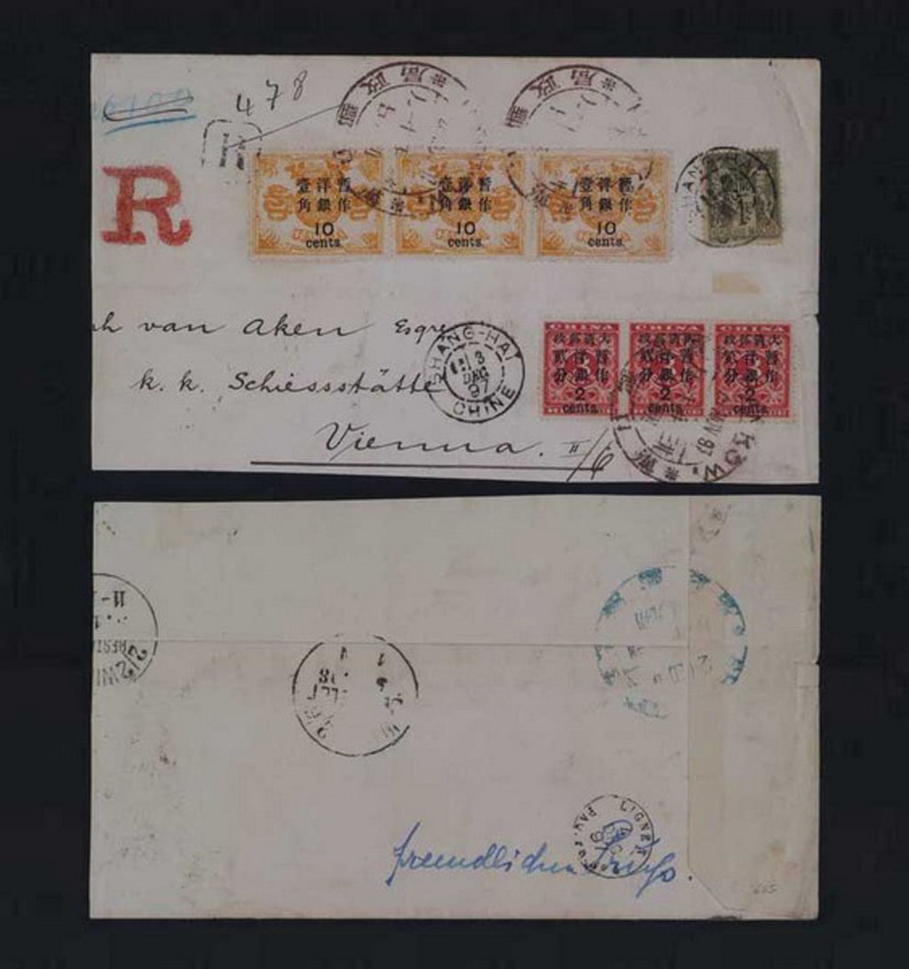 1897年汉口寄维也纳挂号封,贴红印花加盖暂作邮票大字2分横三连、慈禧寿辰纪念大字长距改值邮票10分/12分银横三连,销汉口邮政局11月29日黑色中文大圆戳,经上海盖上海邮政局12月2日蓝色中文大圆戳,加贴法国在华邮局“Chine”1法郎邮票一枚,销上海12月3日法国在华邮局日戳,封背盖12月4日“LIGNEK”轮船签收戳,有维也纳1898年1月5日到达戳,甚为珍贵