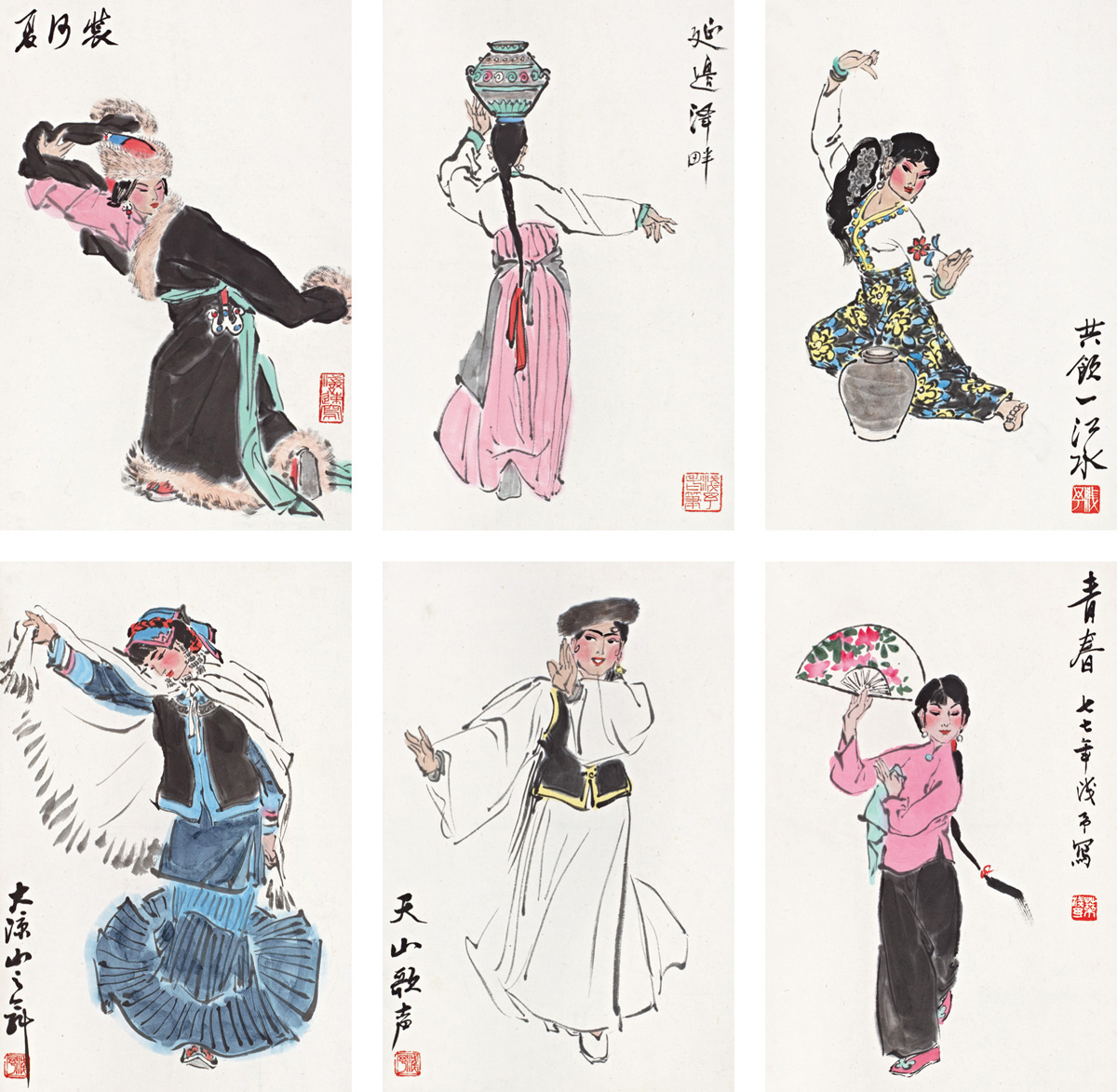 说明:叶浅予早年以漫画名闻天下,继则以描绘舞蹈为世所知。是册八开,依次题“拉萨舞步”、“夏河装”、“延边泽畔”、“共饮一江水”、“快乐的罗索”、“大凉山之舞”、“天山歌声”与“青春”,分别表现藏族、甘南藏族、朝鲜族、傣族、彝族、维族和汉族的舞蹈人物,仅凭寥寥数笔,便能勾勒出人物的体态眼神,极富感染力。此册绘于1977年,彼时十年阴霾已散,笔端自然溢满喜悦。