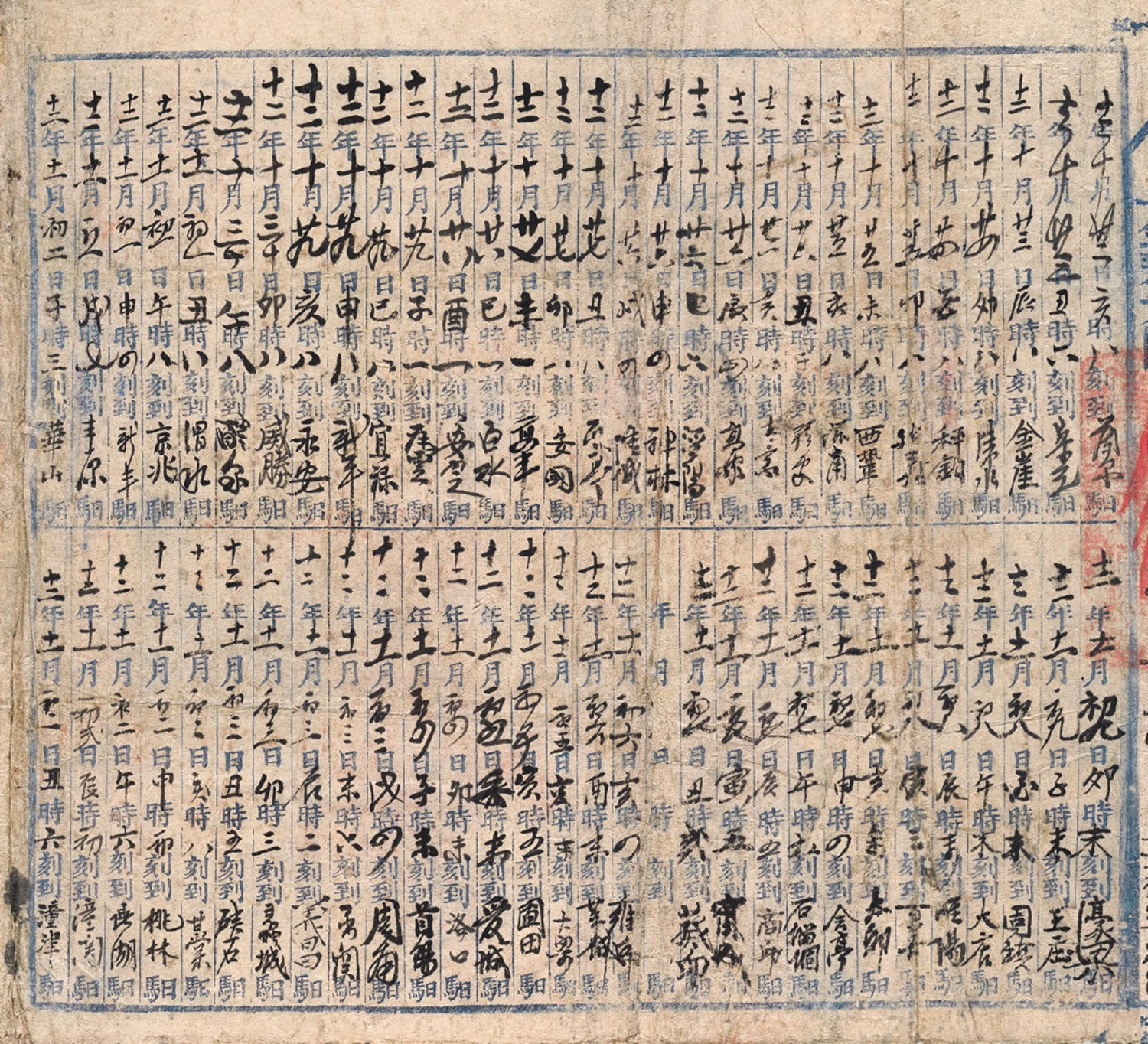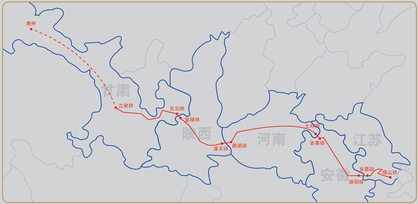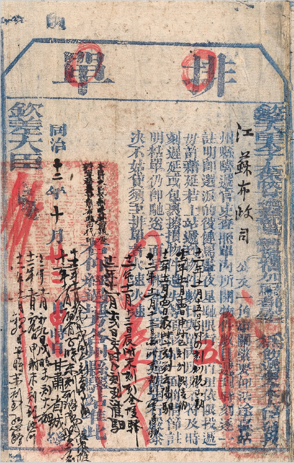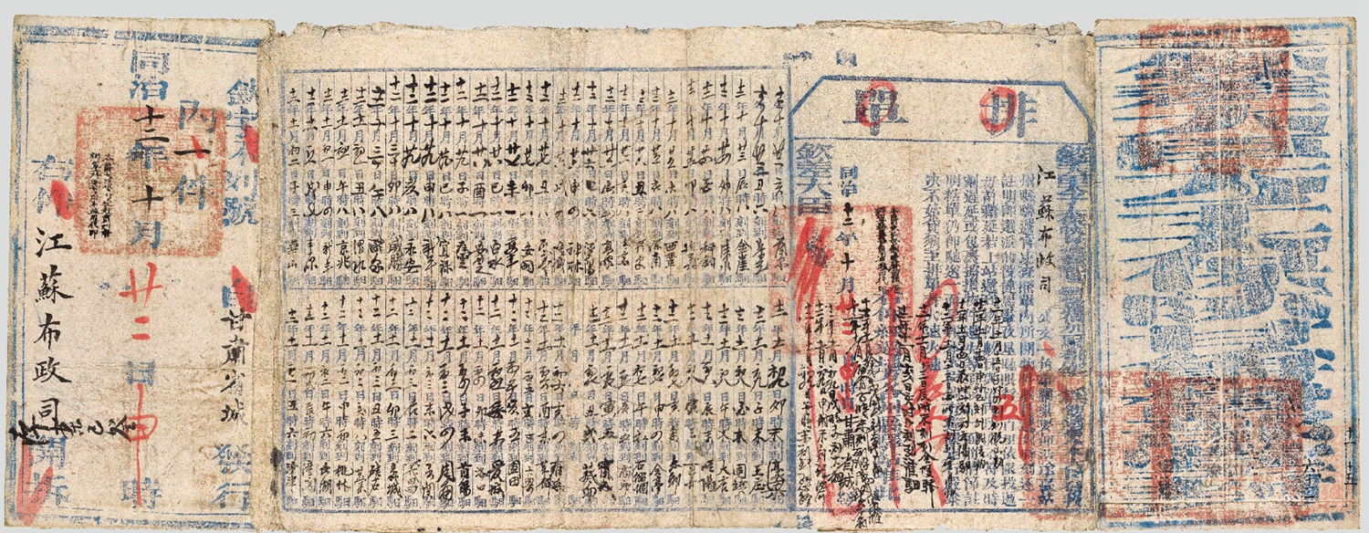 同治十二年(1873年)甘肃省城寄江苏布政司大型驿站排单公文封,(农历)十月二十二日申时封发,由钦差大臣太子太保陕甘总督部堂一等恪靖伯加一骑都尉左(宗棠)发递江苏布政司紧要公文,由于左宗棠亲赴肃州(今洒泉)督办军务,总督关防随身携带,而驿律规定无印信者不可入递,故借用甘肃布政司印信发出,所以,由总督部堂发出的此件公文封套上,共加盖满汉文“甘肃等处承宣布政使司之印”五处,而非总督关防,关印之上另有“本爵大臣总督部堂赴肃州督办军务委甘肃布政司代印”木戳手盖二处,封背贴有完整排单,正面注明“健马昼夜星驰限行五百里依限投递”,详细记载途经驿站名称及到达时刻;因排单格式共为六十格,此件途径站点多于六十,致使排单之内无法容纳,继而由排单尾向右继续书写余下站点,总计驿站七十处;此封自十月二十二日申时封发,遂于当日亥时经兰泉交驿夫传递,依次途经定远、金崖、清水、秤钩、延寿、西巩、保宁、通安、青家、高家、泾阳、神林、隆城、瓦亭、安国、高平、白水、安定、瓦云、宜禄、新平、永安、威胜、醴泉、渭水、京兆、新丰、丰原、华山、潼津、潼关、鼎湖、桃林、甘棠、硖石、蠡城、义昌、函关、周南、首阳、洛口、管城、圃田、大梁、莘城、雍丘、葵丘、宁城、商丘、石榴固、会亭、太邱、百善、睢阳、大店、固镇、王庄、濠梁、红心、池河、大柳、滁阳、东葛、江淮、金陵、云亭、云阳、毗陵,共六十八站,并于十一月十五日子时抵达锡山;此封自西北甘肃寄出,凭借马匹之力,历时不及一月横跨我国甘肃、陕西、河南、安徽、江苏五省东、西大部近二千公里,足以显现清代邮驿系统四通八达、传递快速;清代驿站公文封套贴有完整排单者极为罕少,此件途经七十处站点,为目前所见由西北至东南最长邮路之排单实物,系研究清代驿站史最佳实物史料,致为珍贵,保存完好,谢鄂常旧藏