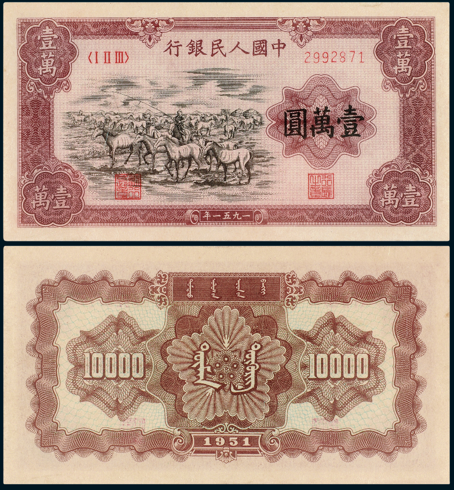 1951年第一版人民币壹万圆“牧马”一枚,背蒙文,新疆地区行用,位列一版币六珍之首,有一版币票王之盛誉,存世稀少,迄今为止发现未逾百枚;此枚保持原始状态,色彩饱满,边纸宽阔,是目前所见“牧马”流通票中的佼佼者,保存状态在此之上者屈指可数,极为珍罕,CMC40,八二成新