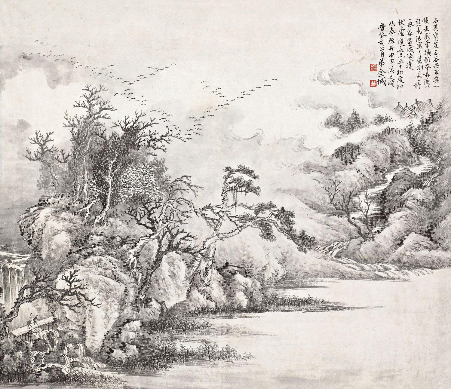 Signed Jin Cheng, dated guihai,1923, inscribed, with a dedication and two seals of the artist.