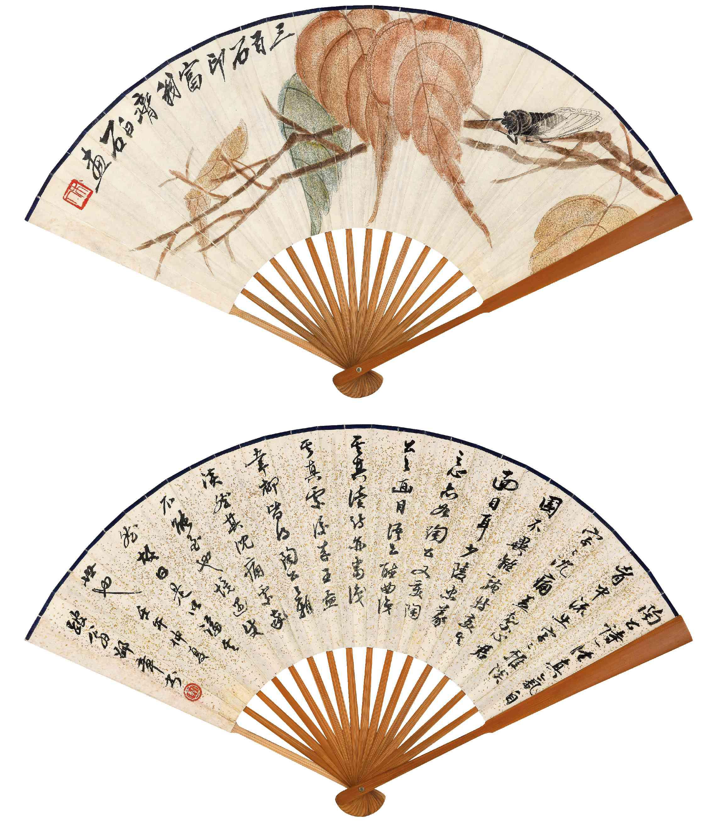 TEXTURE: Folding fan, ink and color on paper, ink on gold-flecked paper.