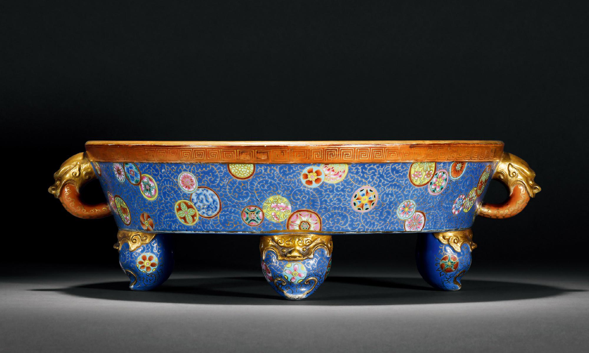 AN EXTREMELY RARE BLUE GROUND FAMILLE ROSE WASHER Qianlong Period, Qing Dynasty