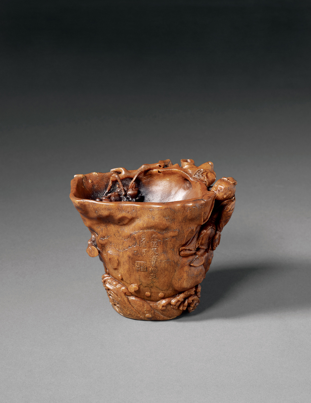 A CARVED RHINOCEROS HORN CUP 17th century
