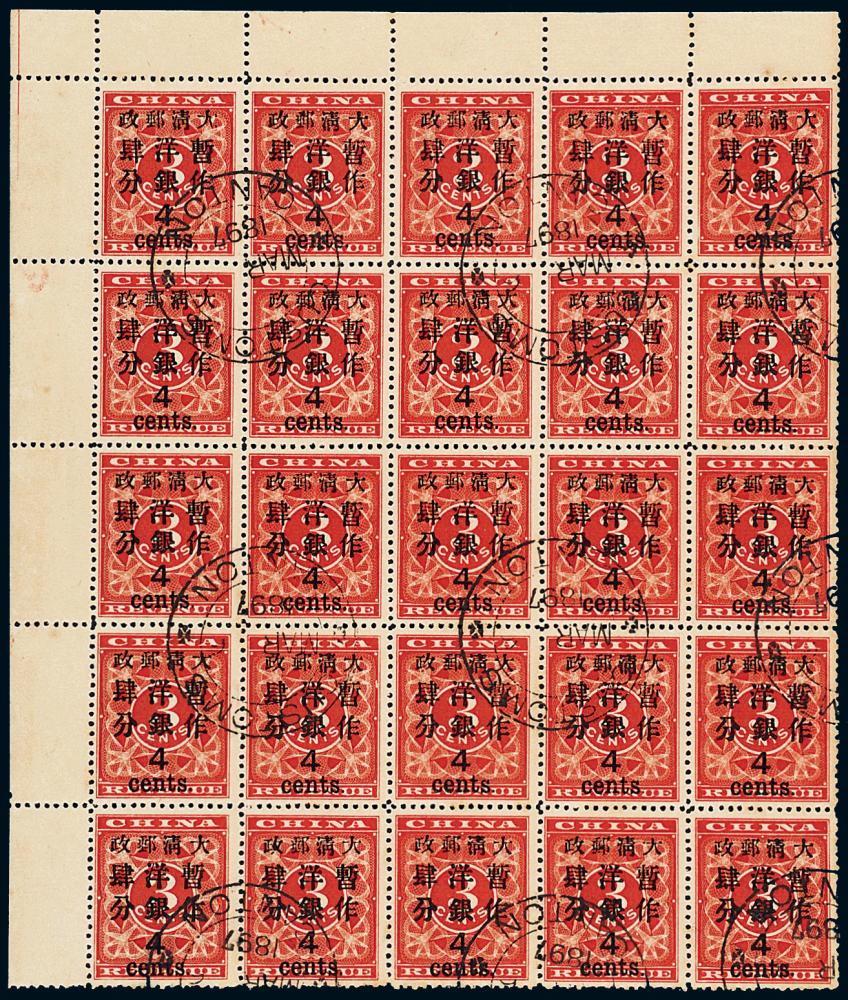 null 1897 Red Revenue Stamps Surcharged for Postal Use large figures 4c X 25, whole pane, with margins, cancelled by Canton customs datemark, OG, UH, Rare, VF