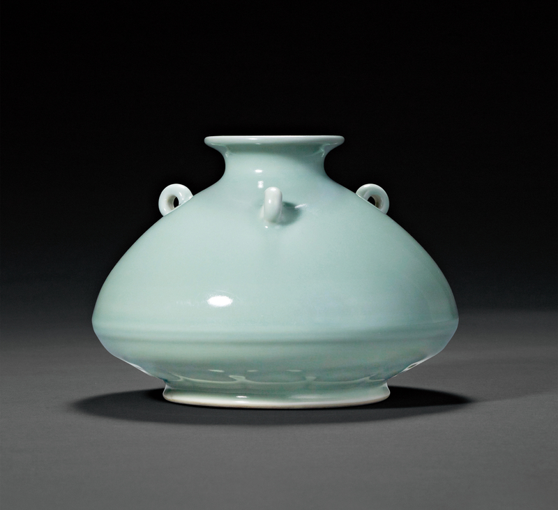 AN EXTRAORDINARY CELADON GLAZED VASE WITH THREE RING LUGS Seal Mark and Period of Yongzheng, Qing Dynasty