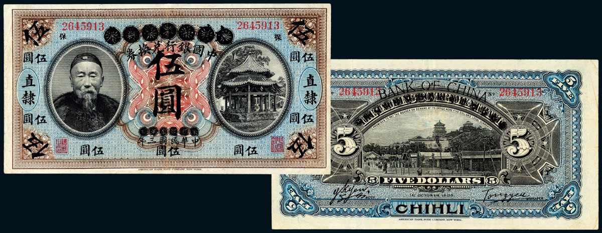 null 1909, Tai Ching Bank changed to Bank of China Coupon, 5 Yuan, Zhili, Rare, XF