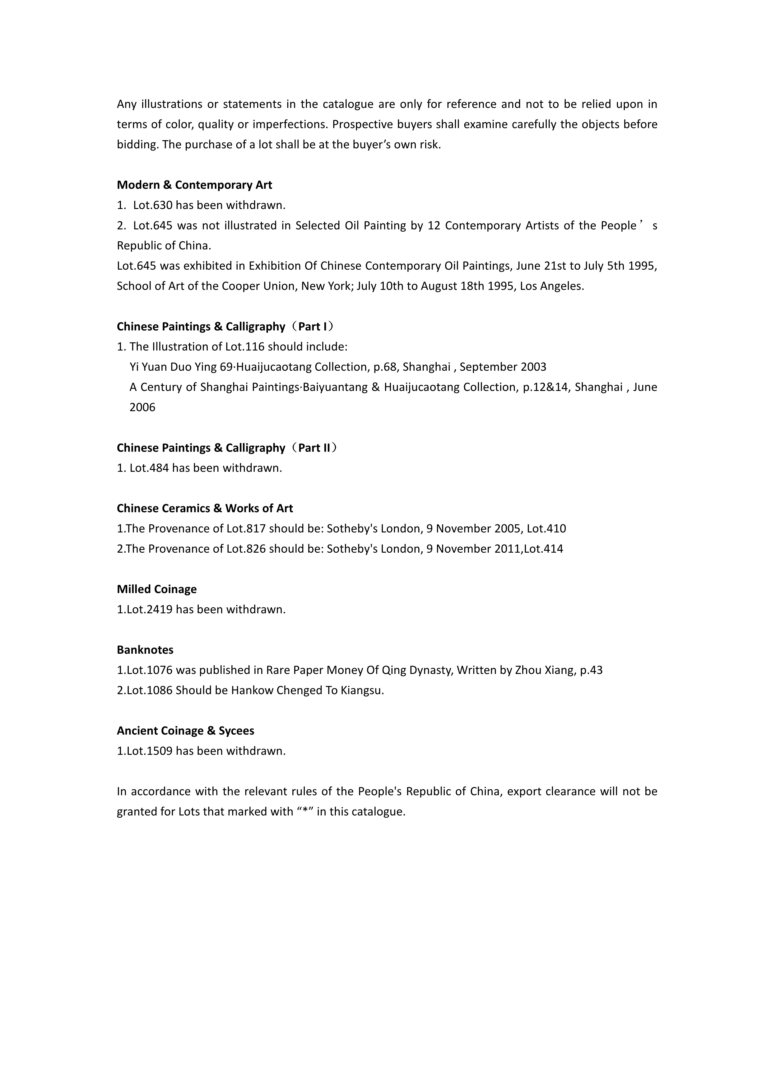 Statements and Corrections of Catalogues of 2019 Autumn Auctions
