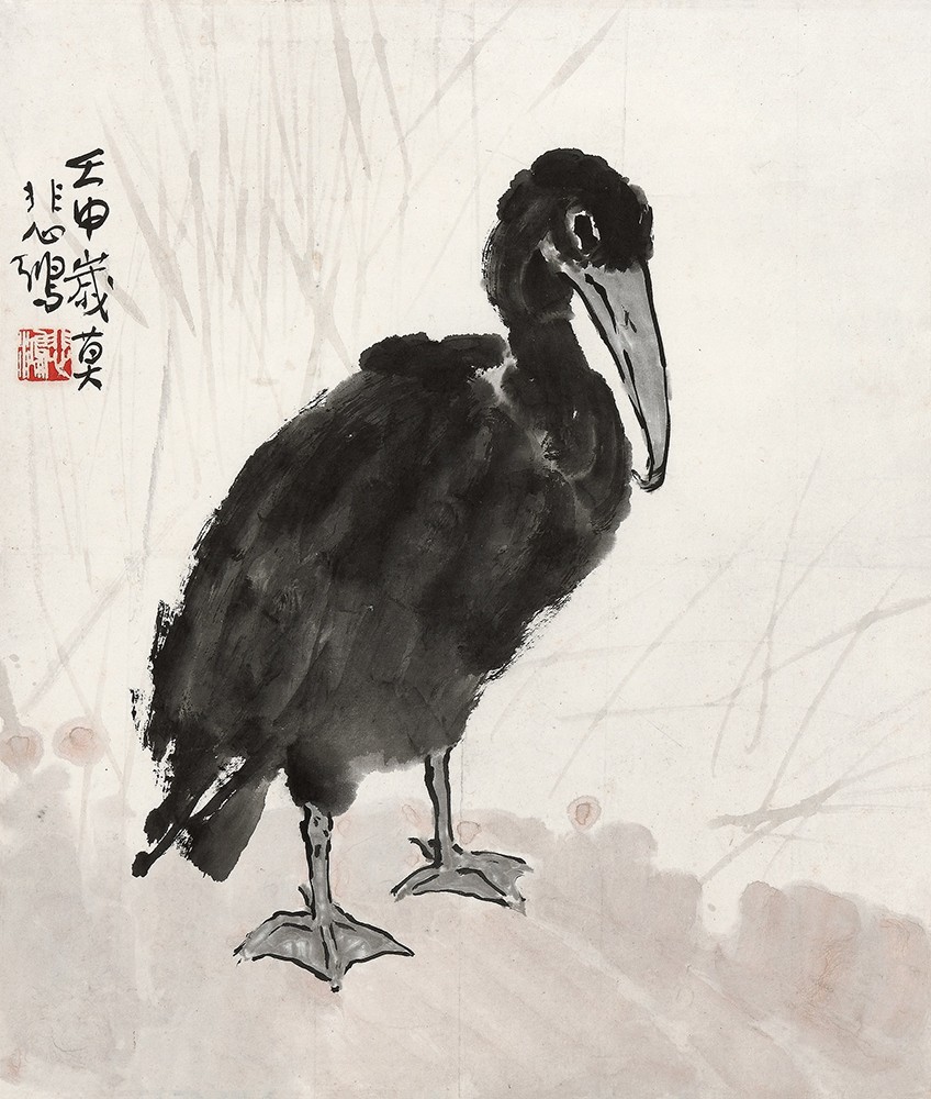 吴昌硕《东篱丛菊笑西风》画于1914年,写赠湖州同乡宋尊望,磐石的稳重与菊花的灵动对比强烈。徐悲鸿1932年绘制的《泽畔鱼鹰》,是画家着意以西方素描造型改良传统中国画的典型佳作,民国年间即曾两度出版,十分难得。潘天寿横幅自作诗《飞来峰》为1950年代末期书作,结体奇崛,气势恢宏;另幅《苔石八哥》系画家艺术盛期所制,属其代表题材。
