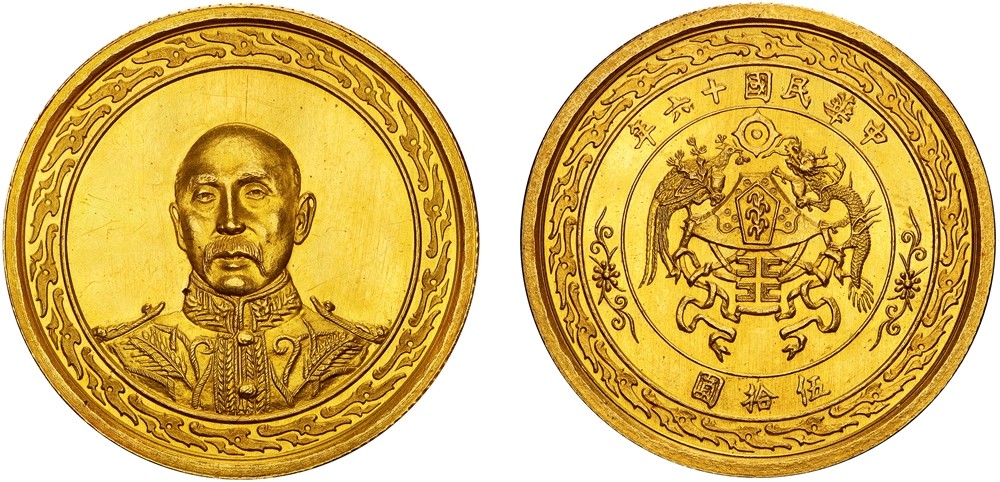 民国十六年张作霖戎装像背龙凤黼黻图伍拾圆金币样币(PCGS SP64),实物遗存仅三枚,国内外权威目录皆将其列为最珍贵的中国金币,重要非凡。