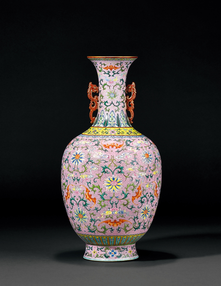 | 清乾隆 粉地洋彩锦上添花万福莲花纹夔龙耳瓶 49.5cm. High |
