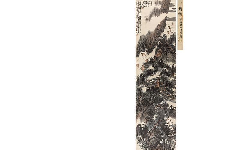 濡染大笔何淋漓 潘天寿山水巨制《飞帆》简评 《飞帆》作于1928年,被《潘天寿书画集》编委会评为潘氏重要的山水作品,历经十数次权威出版着录,在潘公凯主编、浙江人民美术出版社1996年印行的《潘天寿书画集·下卷》中,有专文介绍,爰录如下: “此图(《飞帆》)与《青山白云图轴》(现藏中国美术馆)一样,均为早年重要的山水作品,由此可见作者当年在山水画方面所下的功夫,两幅作品画面均复杂繁密,层次井然。皴法或有石涛、石谿影响,但放笔直下的痛快爽劲则系自家特色。值得注意的是作者对于画面气势的重视与处理,两幅画都强调了从左下趋向右上方的斜势,使浩荡江水似乎从天而降。尤其是此图上端的绝壁,对增强气机起了重要作用。潘天寿气质深处的精神力量,在青年时代就随时随地地表露在作品上,诚可谓天性使然。”