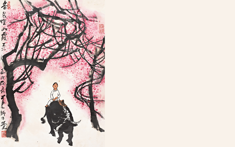 “春花灿如霞”是春天的牧歌。“东风随意扫,发我枝上花”,“繁枝容易纷纷落,嫩蕊商量细细开”,这些对春日醉人美景的描述,正可为画意的参照:道路两旁的梅树繁枝密萼,蔓延交叠如华盖,满树怒放的殷红春花,仿若初升的朝霞,令人陶醉。