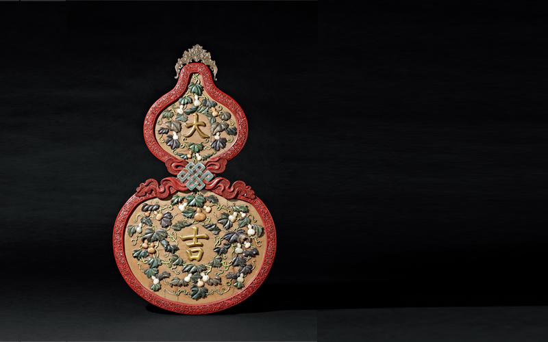 挂屏取葫芦为形,剔红边框色泽鲜艳,浮雕缠枝花卉纹,间以八吉祥、福寿纹,并于腰部饰绑缚结带,镶嵌掐丝珐琅盘长结。挂屏内镶金彩“大吉”二字,周围嵌玉石葫芦藤蔓缠绕,上结葫芦累累,寓有“瓜瓞连绵”之意;葫芦藤蔓多以碧玉为叶,赭、白、青色玉石为葫芦果,以示新老之别,形肖色近。挂屏顶安蝙蝠形挂钩,设计巧妙又含吉祥寓意。
