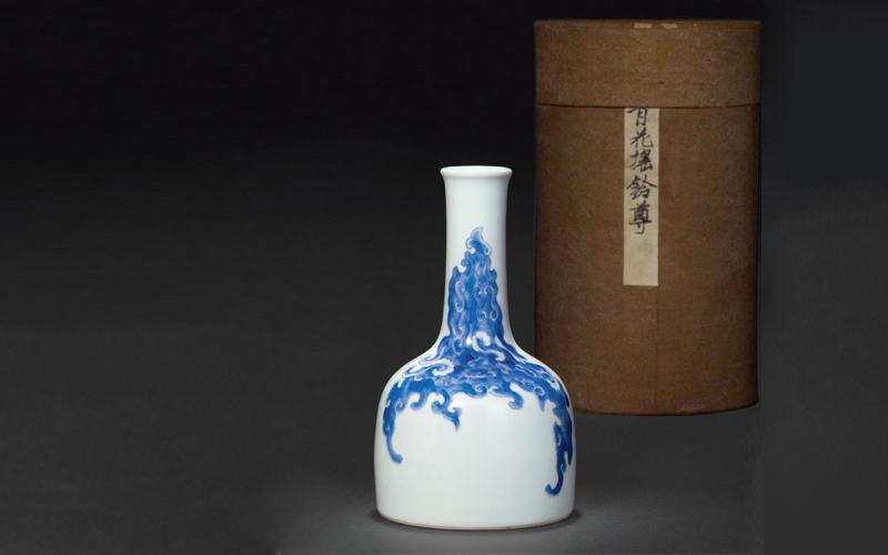 18.5cm. High. 拍品颈腹间对称绘两组青花夔凤纹,夔凤形若祥云,身首莫辨,布局依器形自然铺展,纹、形巧妙相合。造型小巧别致,胎质细腻,釉面光润莹澈,青花色泽淡雅,为雍正官窑之精品。