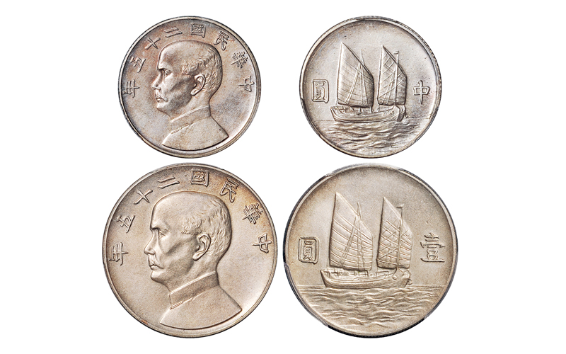1897年奉天省造光绪元宝库平七钱二分铝合金试铸样币、库平三钱六分铜质试铸样币、库平一钱四分四厘铜镀银试铸样币、库平七分二厘铜质试铸样币各一枚。