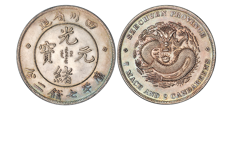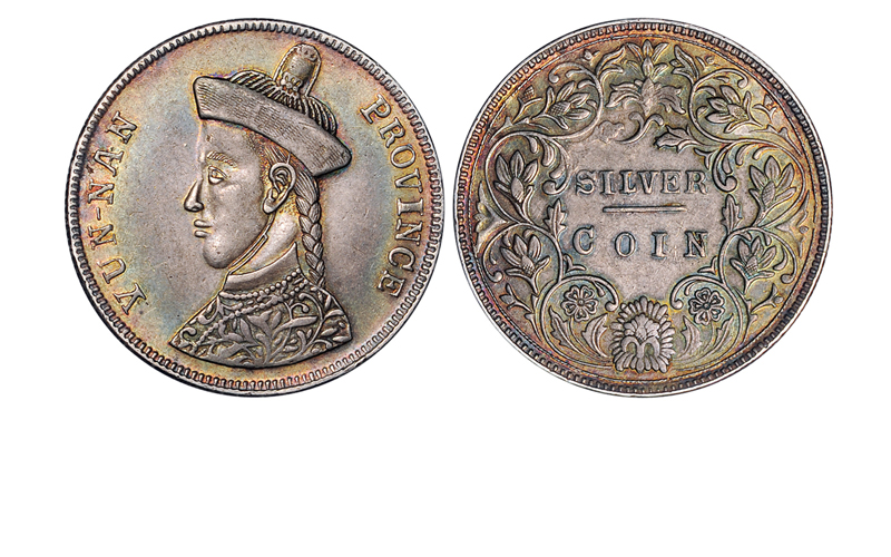 1907年云南省造光绪像双面英文一卢比银币一枚,由于西藏地区大量流通印度卢比,而西藏未设局铸造银币,比邻西藏的四川省恐利益外流,奏请开铸仿印度卢比银币予以抵制,由此推测,此枚云南铸造卢比当仿制四川作法设计铸造,但最终并未铸行,存世极为罕见。