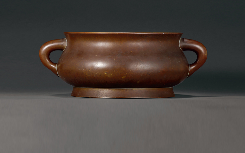 拍品尺寸巨大,炉形丰满,器壁厚实,颇显端庄稳重。口沿截平,束颈垂腹,双耳粗壮圆润,膛内曲线均匀。皮色如栗壳,其间参杂雪花,金耀玉粟如繁星点点,素雅怡人。