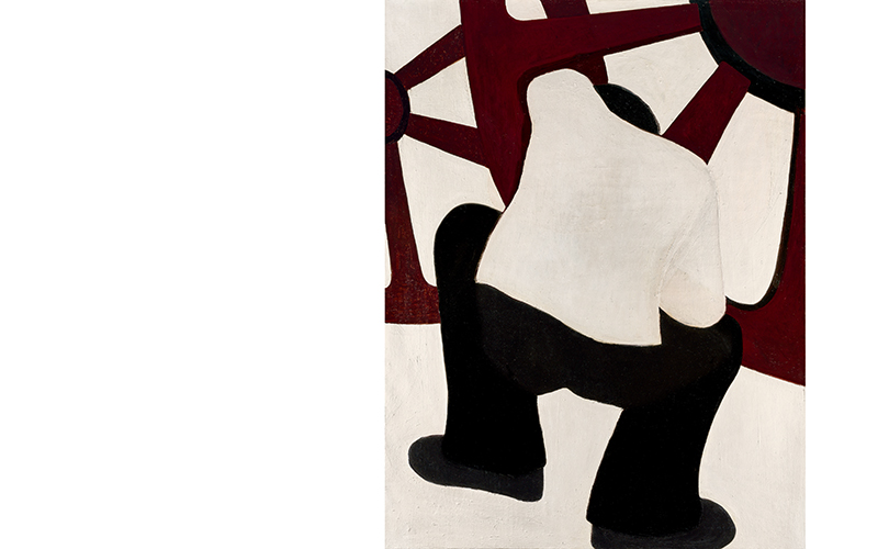 贺慕群出生、成长于民国时期,属于第二代赴法女性画家。1965年起定居巴黎,其作品明显受到“后印象派”和“巴黎画派”的影响,形式构成简洁,自觉追求平面意味,色彩优雅而略含忧郁,情绪敏感而克制,带有早期“表现主义”比较温和的情感面貌。尽管贺慕群从未进过正规的艺术院校,但她凭借自己的天赋和勤奋,1968年巴黎“妇女沙龙展”中以《玩具系列》获得油画大奖,嗣后,在欧洲各国巡回展出。 《蹲》创作于1970年,构图简洁,意蕴丰富。画中白衣黑裤的人蹲坐于中央,右肘撑膝,左肩高耸,似乎是在摆弄修理眼前巨如车轮的器具,呈现出面朝画里背朝外的经典造型。画家采用大面积的纯色平涂,在色彩的明暗和碰撞之间塑造形象,消解阴影而不失体积感。画家笔下的每一层油彩都很薄,但是多层叠加,白色油彩轻轻地覆盖在黑、棕色之上,平而薄的质感颇具版画的视觉效果。