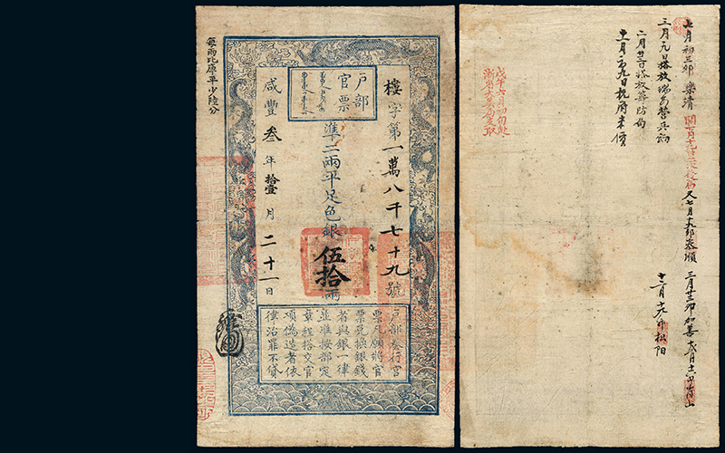 咸丰三年户部官票伍拾两一枚,楼字第一万八千七十九号,为户部官票最大面值票,背右侧依次有“七月初三卯 乐清”、“闰七月十九日二次发局 又七月十九卯泰顺”、“三月廿三卯加善”、“十二月十六卯肖山”、“三月一九日搭放瑞安营兵饷”、“十二月十九卯松阳”、“二月廿三日搭放筹防局”、“十一月初九日杭府米价”之墨书与戳记;左侧盖有“戊午六月初旬赴浙省大美局支取”长条形红色戳记,详细记录此票作为浙江省提拨的筹防经费搭放军饷,于乐清、泰顺、嘉善、萧山、瑞安、松阳、杭州等地的流通经过,颇具史料价值;官票票面整洁,图文清晰,保存十分完好,