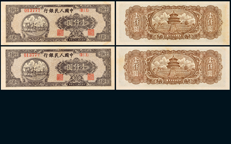 1948年第一版人民币狭长版壹仟圆“双马耕地”二枚,同号码,均为趣味“豹子号013777”,其中一枚号码末位漏墨,极少见,PMG 63、64